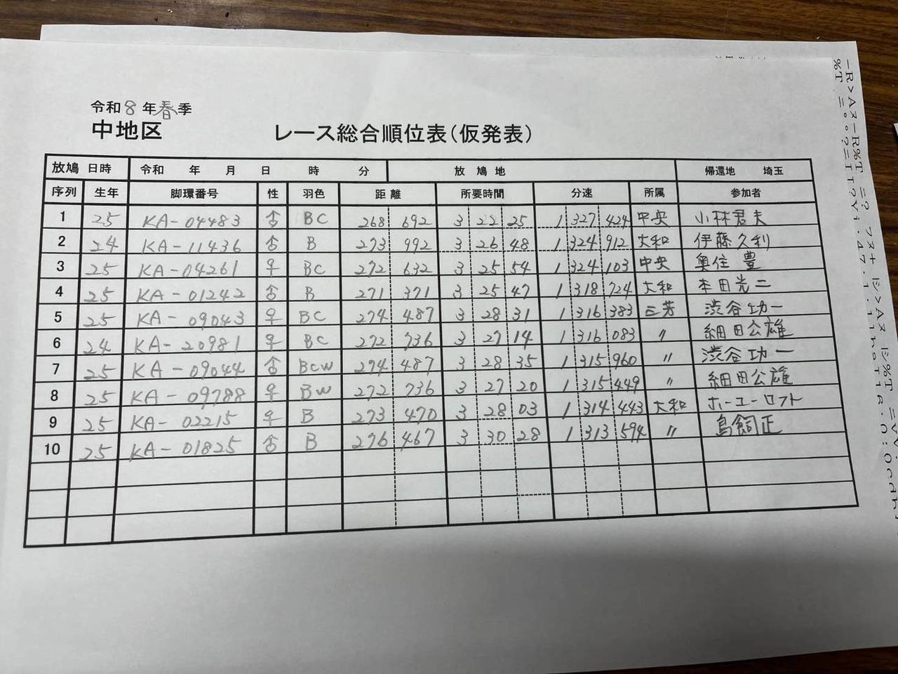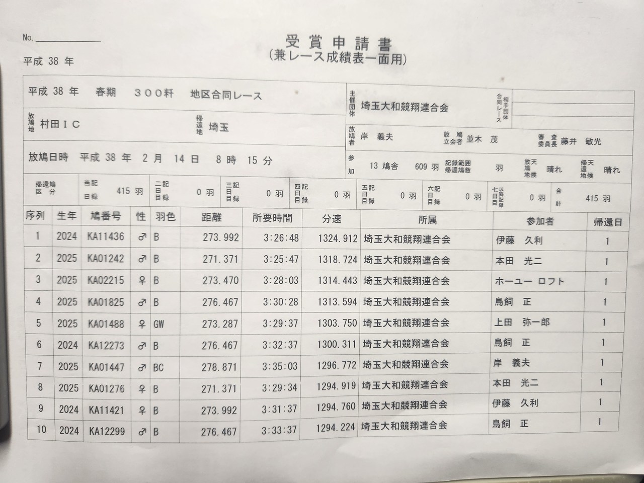 速報 2月14日、埼玉中地区6連合会合同で村田300Kレース実施されました。東北地方の天候不安を考慮し、放鳩地は50k手前の村田に変更され8時15分に放鳩されました。前日に比べて気温が上昇し、無風という条件で分速1200ⅿ台かと思われましたが上位入賞鳩は1300を超えるレースとなりました。このレースを制したのは埼玉中央連合会の小林君夫鳩舎で実距離268km、分速1327m/mでした。おめでとうございました! 総合2位に伊藤久利鳩舎(大和)、3位にお馴染み奥住豊鳩舎、4位以降は本田光二鳩舎、5位、7位に渋谷功一鳩舎、6,8位に細田公雄鳩舎、9位にお隣のホーユー・ロフト、10位に鳥飼正鳩舎が入り、大和と三芳からも多数入賞鳩出ました。※4位の本田鳩舎の入賞鳩はヴィレム・ドブルインのマーフィーズ・ローの全兄弟の仔×ジダン&オリンピック・ハリケーンの孫、5位渋谷鳩舎の鳩もやはりドブルインの基礎鳩オリンピック・ハリケーンの孫鳩で、25年連合会エース鳩第1位鳩の全兄弟とのことです。9位入賞のホーユー・ロフトの入賞鳩は父親が小笠原悟氏の代表種鳩でウィリー・ダニエルのNエース鳩ウィリーウィリーの直仔で母親は2024年年末のRAに出たリック・ヘルマンス作フレンドシップの直娘(父親はビューティ・92)とのことです。皆さん素晴らしい血統による上位入賞で本当に羨ましい限りです。※ちなみに、CHロードロフトは全く入賞圏外に終わりました。レース結果リストを会館に忘れてしまいました。アップできません。次、頑張ります。 島村