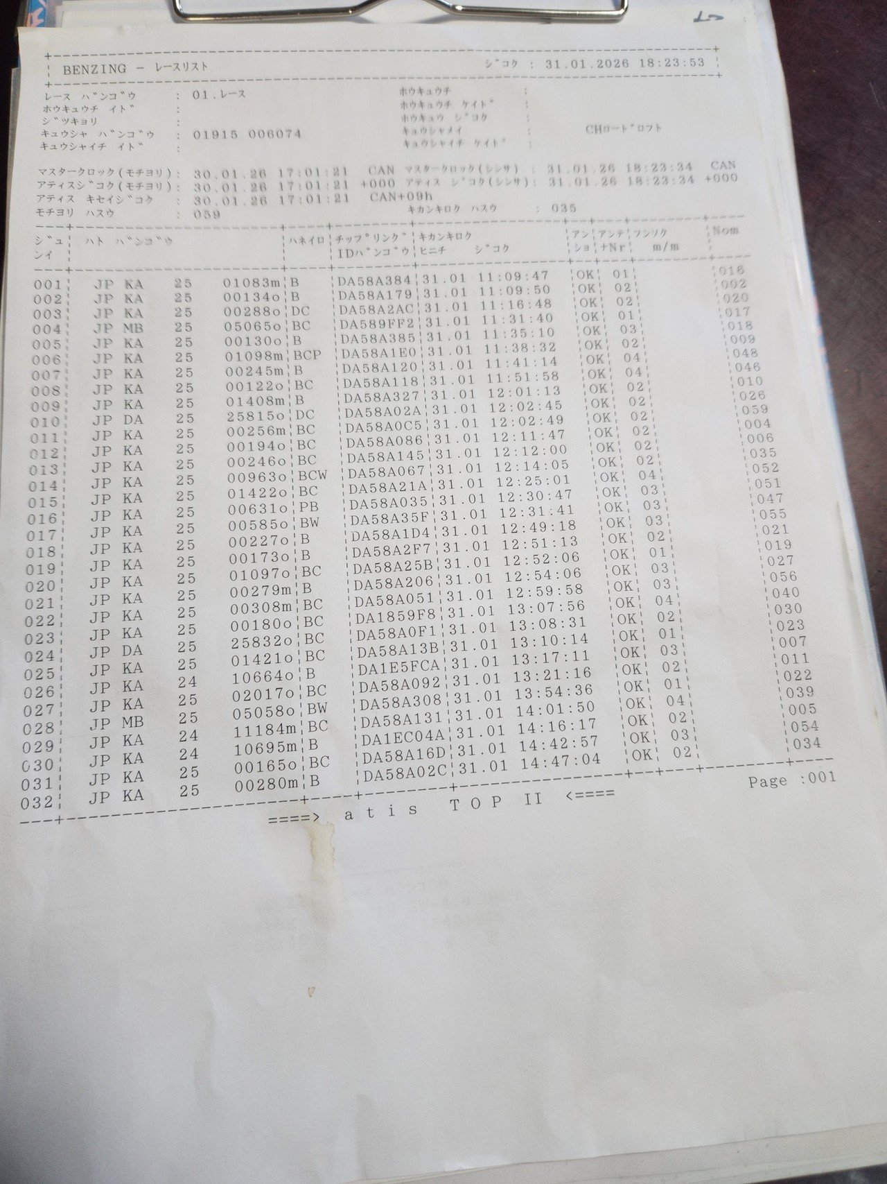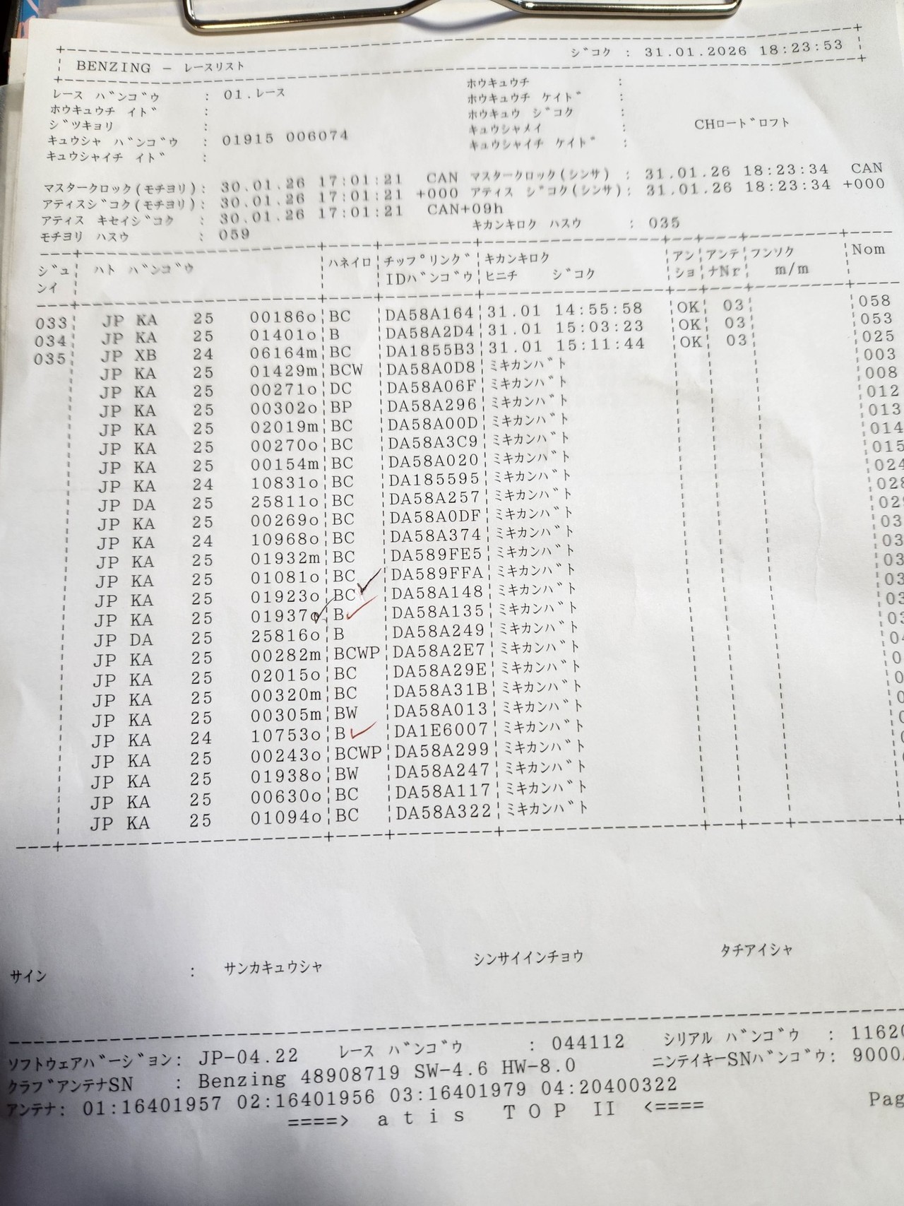お待たせしましておりましたが、1月24日(水)に、埼玉大和連合会主催の春の那須150K模擬レースに参加しました。寒気の影響で、放鳩場所についてもギリギリまで検討を重ねた結果、那須で朝7時30分に放たれました。役員の皆様本当にご苦労様でした。以下にCHロード・ロフトのレース帰還結果をお知らせ致します。強風の中、翌日と合わせてなんとか約90%帰還しました。良い経験になりました。まだまだ経験が足りませんが、これからなんとか成長していく鳩達とともに頑張りたいと思います。現在約280帰還しています。(※入舎総数約450羽)合同鳩舎にご参加の方は下記リストをチェックお願いします。翌日25日午後以下の鳩も遅れて帰還しています。22KA09190BC♂(13時7分)23KA30433BC♂(13時49分)23KA23197BC♀(14時13分)23KA28893BC♀(16時20分)ちなみに、連合会のトップは強豪本田鳩舎でした。なお、次回の本宮200Kは来週前半の持ち寄り予定のようです。しっかり回復させたいと思います。